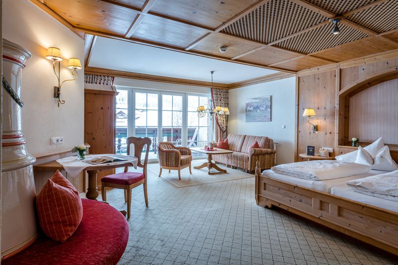 großzügiger Schlaf-Wohnbereich mit gemütlicher Sofagarnitur ( kann als Schlafcouch für 2 Personen genutzt werden) , Sitzecke, Schreibtisch, Kachelofen und Balkon - viel Platz für Ihre Erholung !